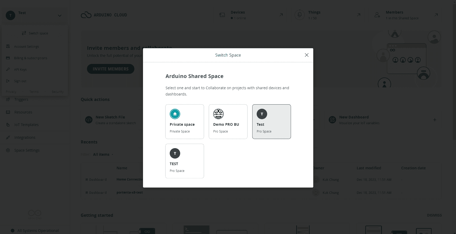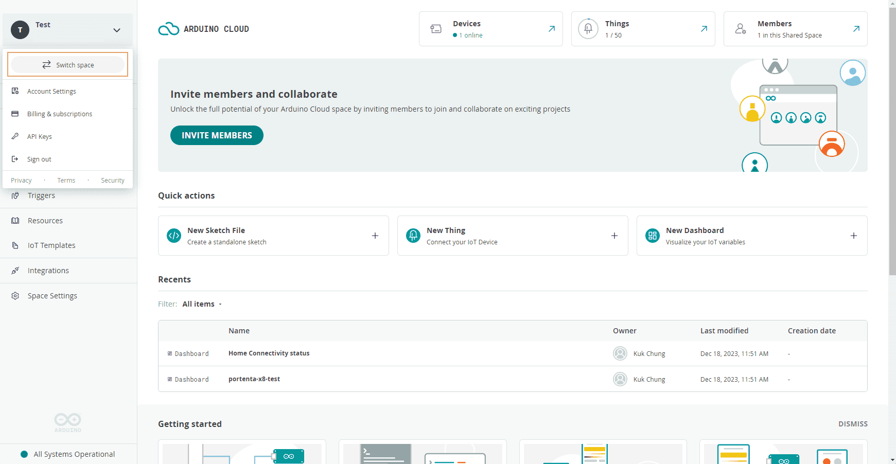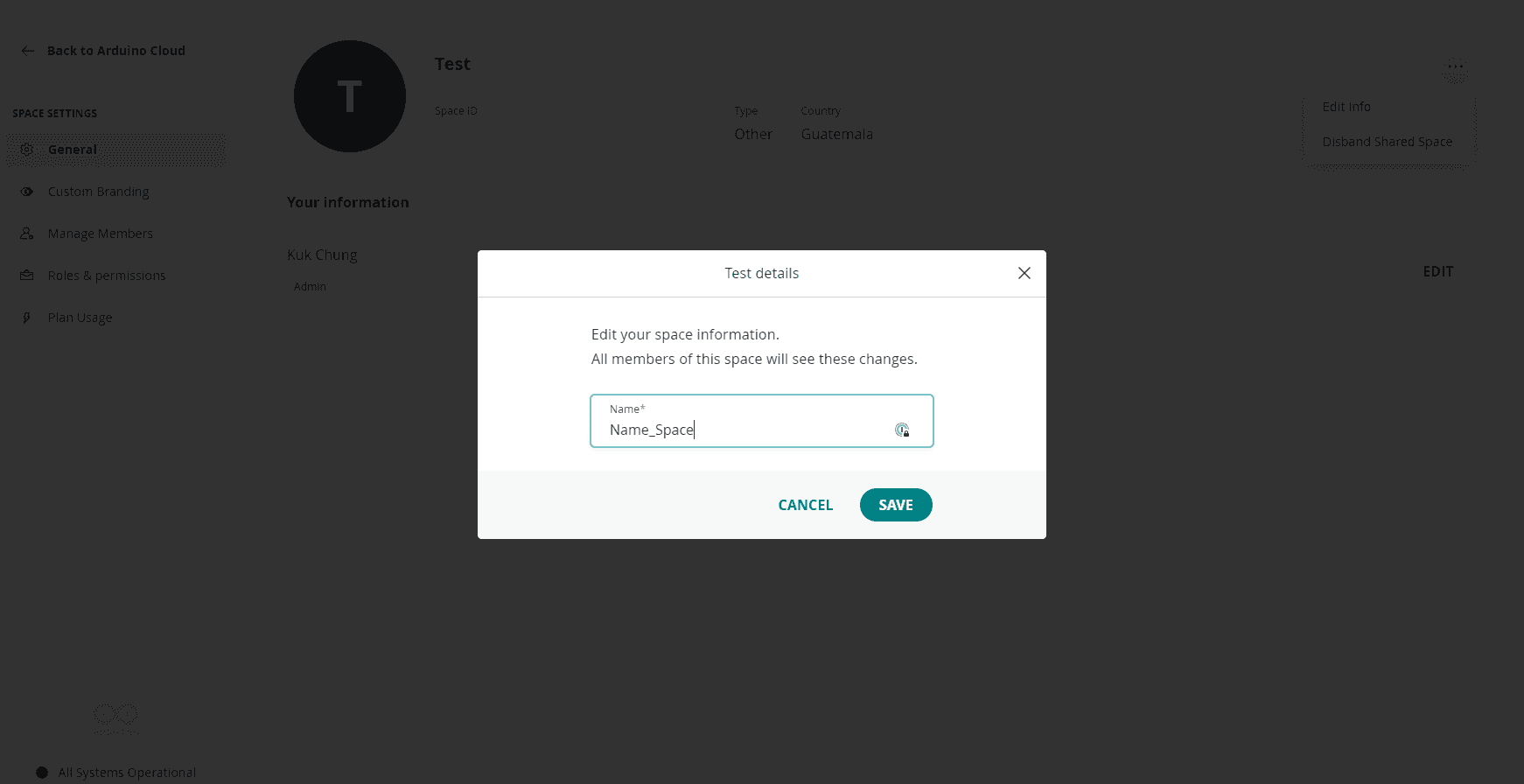 Arduino Cloud > Space Settings > General