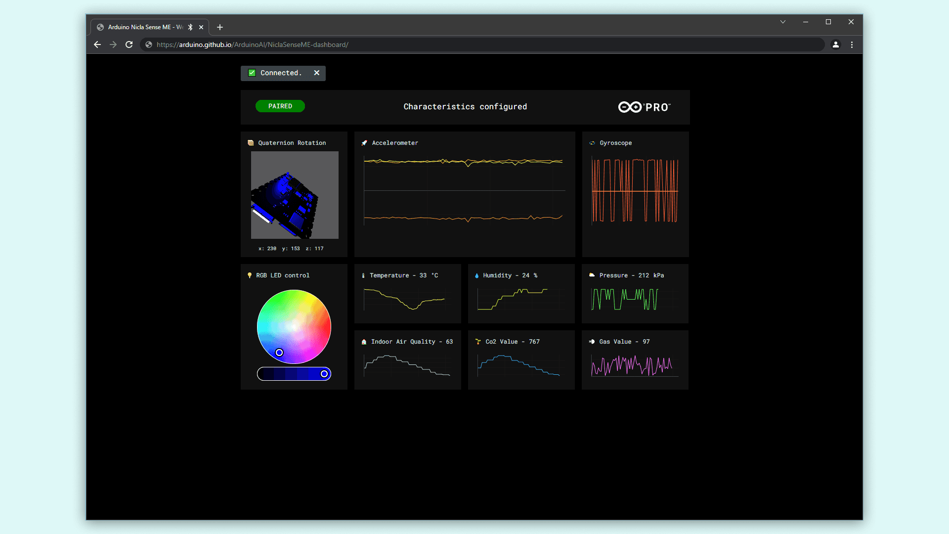 This tutorial shows how to use the web dashboard to read data from the Arduino® Nicla Sense ME sensors.